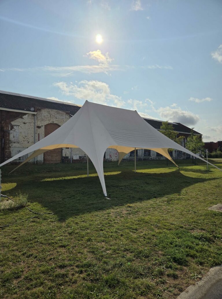 De stardouble of startwin tent is de grote broer van de stertenten. Met zijn dubbele mast zorgt hij voor een nog grotere overdekking bij warme dagen, en bescherming bij regen. Je kan hier zorgeloos onder genieten in je eigen tuin, of op een door jou gekozen locatie. Een VIP feest of bedrijfsevent? Gezellig tafelen voor een trouwfeest, communiefeest en andere gelegenheid? Of gewoonweg een drankje en hapje voor een receptie, verjaardag of meeting. Voor elk event biedt deze luxetent zich aan. De hoogste kwaliteit op de markt, brandveilig en bestand tegen wind, dit in een mooie beige kleur die in elke omgeving past. De centrale masten kunnen ’s avonds voorzien worden van verlichting, en zo gaat het feest door tot in de vroege uren. Bij frisser weer of een windje kan U gebruik maken van de zijpanelen. Deze stertent huren? Contacteer ons voor meer info.